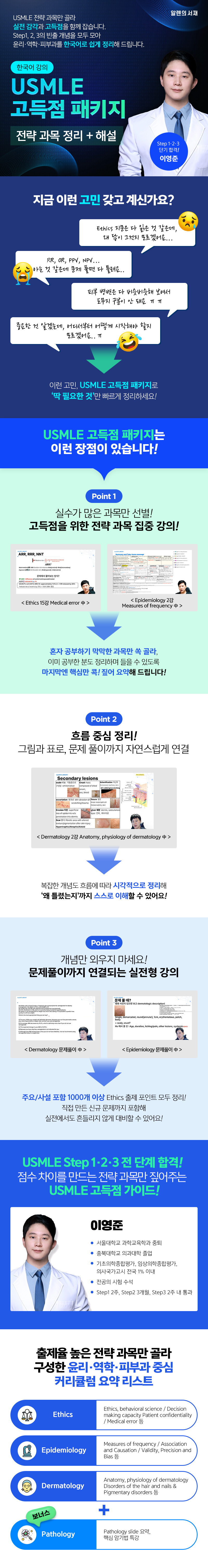 <USMLE 고득점 패키지> USMLE의 전략 과목(Ethics, Epidemiology, Dermatology)의 STEP 1,2,3 빈출 개념을 모두 모아 한국어로 빠르게 배울 수 있는 동영상 강의입니다. *구매일 기준으로 수강 기간이 바로 시작됩니다.