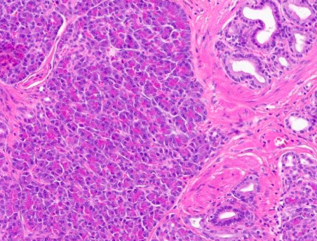 • 해당 조직사진의 우측에는 정상 위샘조직이, 좌측에는 pancreatic acinar cell들이 발견된다. Pancreatic acinar cell은 RNA content로 인해 basophilic한 가장자리와 zymogen granule (digestive enzyme)으로 인해 eosinophilic한 apex로 구분된다.