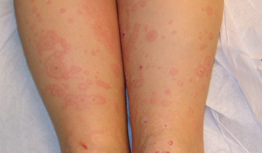 • 고열과 기침, 흉부 청진상 수포음으로 폐렴을 의심할 수 있다. 다리에서 특징적인 다형홍반이 보이고 있으므로 마이코플라즈마를 의심할 수 있다.