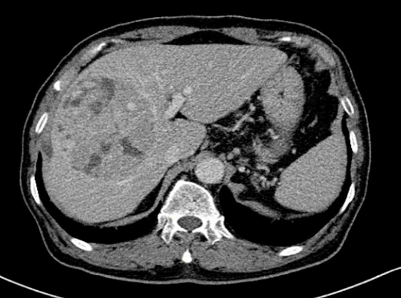 55세 남자가 1개월 전부터 오른쪽 윗배에서 덩이가 만져 진다고 병원에 왔다. 혈압 140/80 mmHg, 맥박 98회/분, 호흡 14회/분, 체온 36.9°C이다. 오른쪽 윗배에 압통이 있으며 반동압통은 없다. 혈액검사 결과는 다음과 같다. 복부 컴퓨터 단층촬영 사진이다. 진단은?