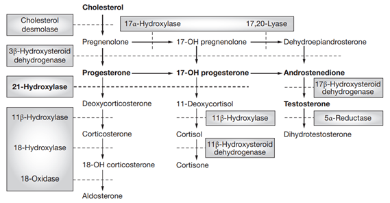 • 17-Hydroxylase: Pregnenolone → 17-OH pregnenolone, Progesterone → 17-OH progesterone 전환, 결핍 시 성호르몬이 감소한다.