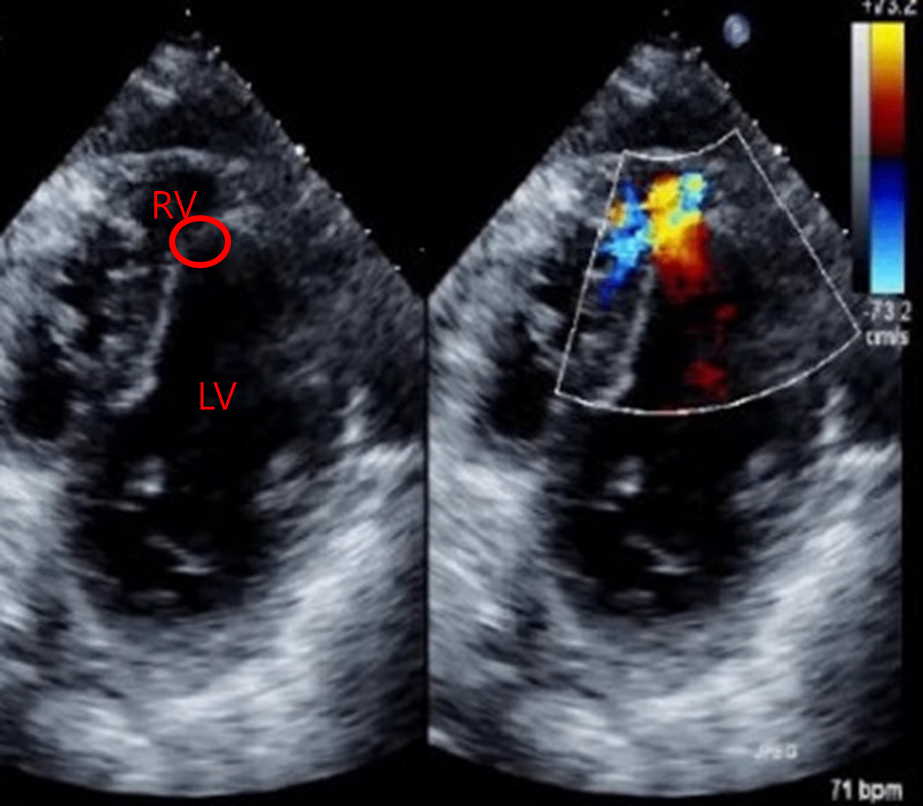 • 심초음파상 LV와 RV 사이의 와류가 확인된다. 따라서 VSR로 진단할 수 있으며, 현재 혈역학적으로 불안정하므로 응급 수술이 필요하다.