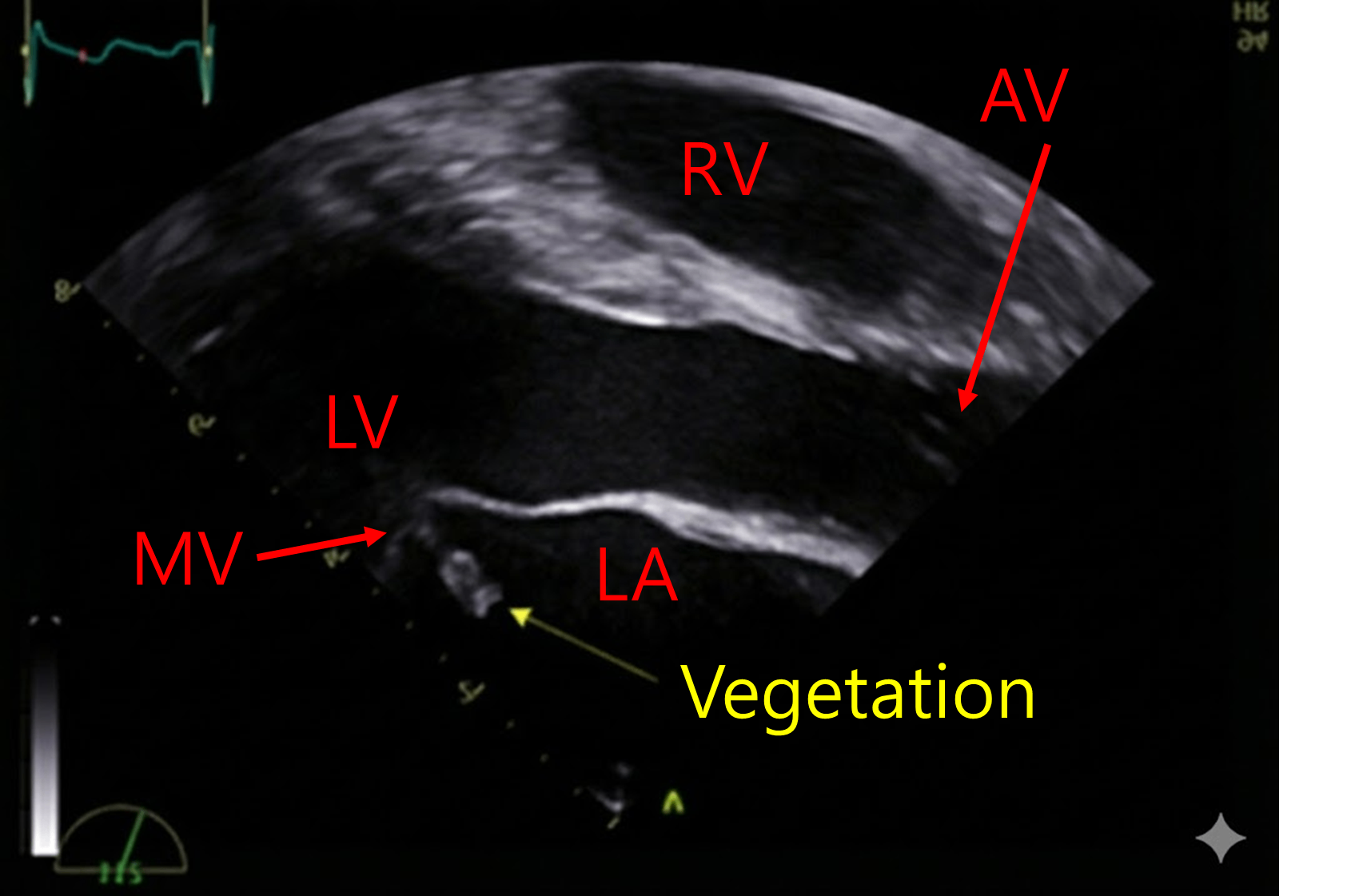 • 평소 익숙한 parasternal long axis view로 상하좌우를 변환하였다. MV에 vegetation이 있는 것을 확인할 수 있다.