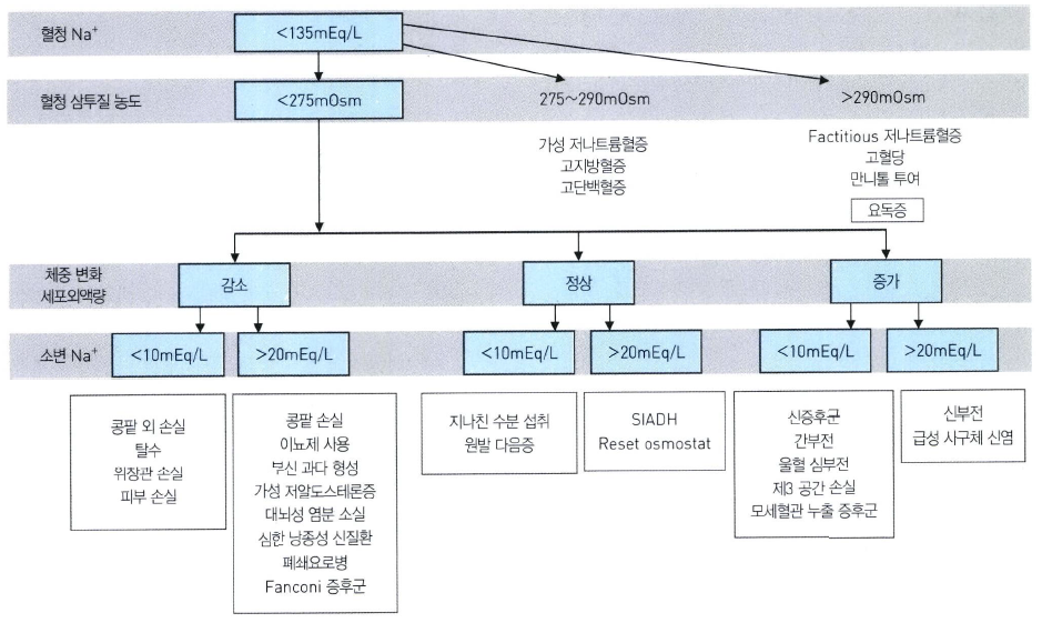 • 저나트륨혈증에서는 먼저 serum osm확인을 통해 가성저나트륨혈증을 구분한다. Serum osm이 감소되지 않으면 가성저나트륨혈증이다.