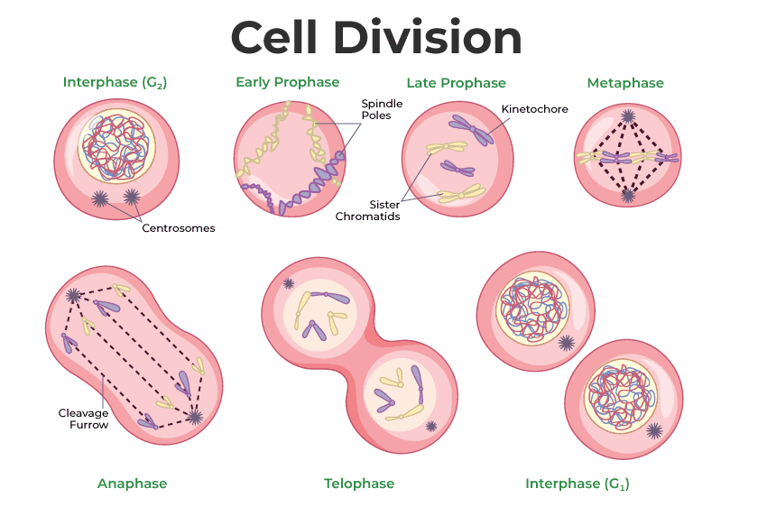 • 말기(telophase): 유사분열방추(mitotic spindle)가 해체되고 염색체의 응축이 풀어진다. 핵이 나뉘어져 풀린 염색질 근처에 핵막이 재형성된다. 세포질 분열이 일어난다.