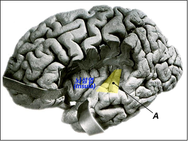 뇌섬엽(insula)을 덮고 있는 이마덮개(frontal operculum)와 마루덮개(parietal operculum)를 제거하여 뇌섬엽을 노출하였다. 위가쪽에서 보았을 때, 관자엽 윗면에서 가로로 달리는 이랑 A를 확인할 수 있었다. 이 영역은?