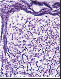 조직의 일부를 은염색(silver preparation)한 사진이다. 이 염색에 양성반응을 보이는 섬유(화살표)의 특징은?