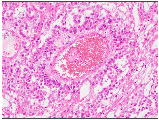 • 조직학적 소견으로는 germ cell이 혈관을 층층히 감싼 구조인 Schiller-Duval body가 특징적으로 관찰된다. 또한, 난황에서 기원하는 암이기에 높은 AFP 수치가 관찰된다.