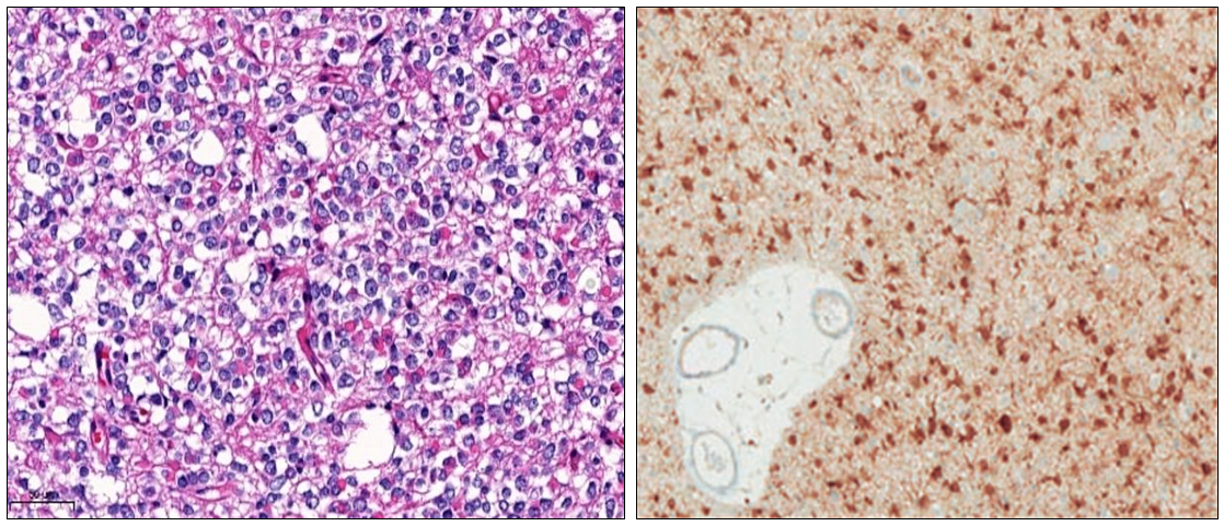 • 조직검사에서는 세포 내 크고 투명한 vacuole과 문합한 혈관들로 인해 나타나는 chicken-wire 소견이 관찰된다. 이는 oligodendroglioma를 시사한다.