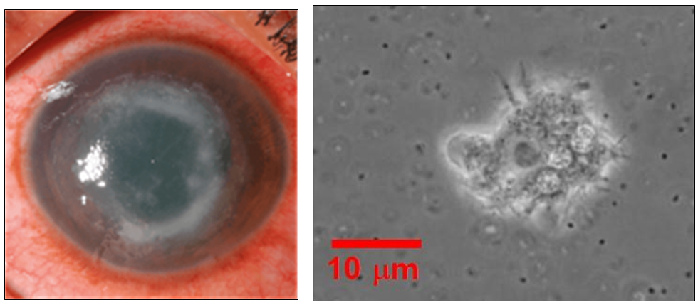 23세 여자가 왼쪽 눈의 심한 통증과 눈부심으로 병원에 왔다. 평소에 콘택트렌즈를 착용했다고 한다. 신체검사에서 왼쪽 각막에 원형의 궤양이 관찰(왼쪽 사진)되었다. 궤양 부위를 도말하여 배양한 결과(오른쪽 사진)이다. 진단은?