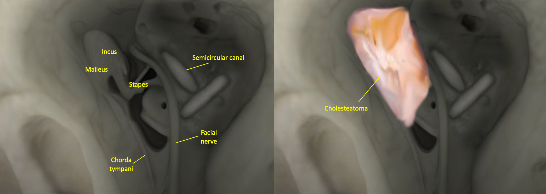 • 진주종이 중이강 내의 다양한 구조물에 침범함에 따라 다양한 합병증이 발생할 수 있으며 대표적으로 이소골 파괴, facial nerve 침범에 따른 안면마비, labyrinthine 침범에 따른 fistula 등이 있다.