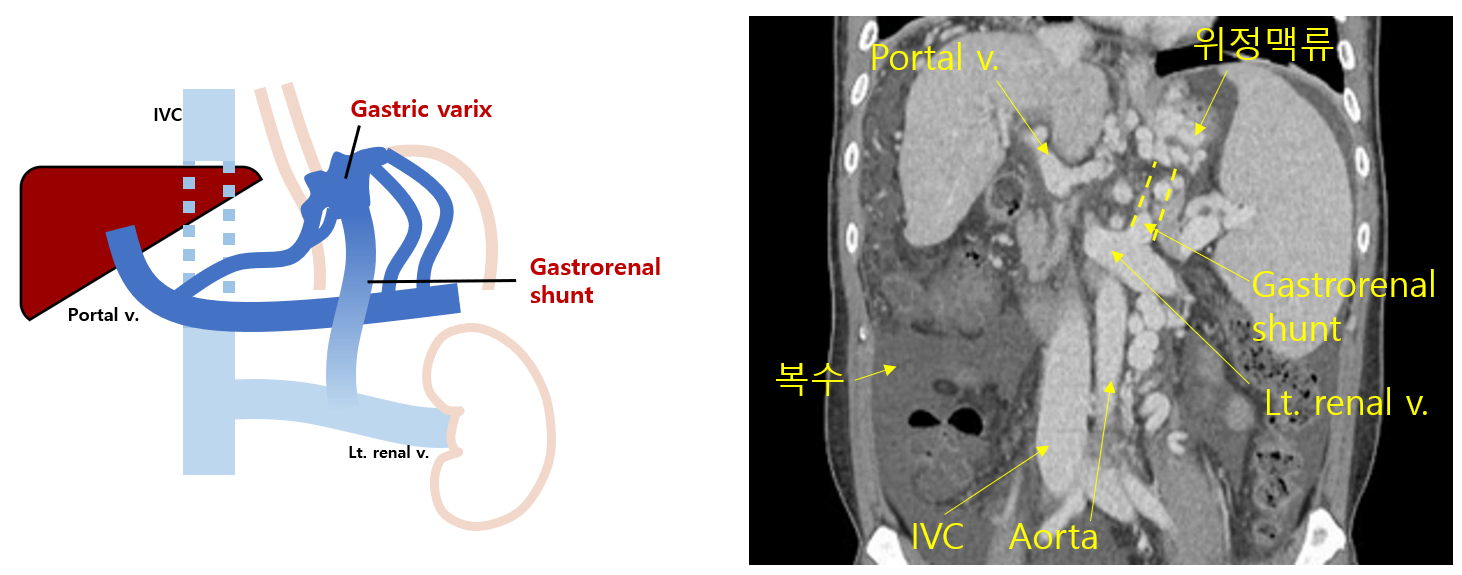 • CT상 위정맥류와 Lt. renal v. 사이의 샛길인 gastrorenal shunt가 있음이 추정된다. 심한 portal HTN으로 인해 발생할 수 있다.