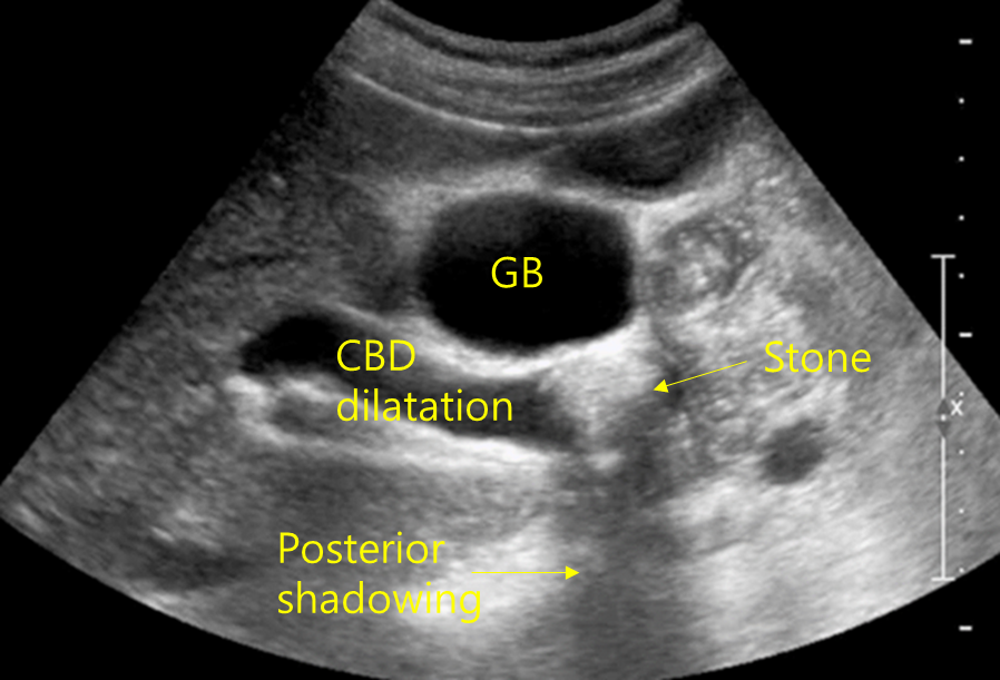 Img | US: CBD stone with posterior acoustic shadowing, proximal CBD dilatation |