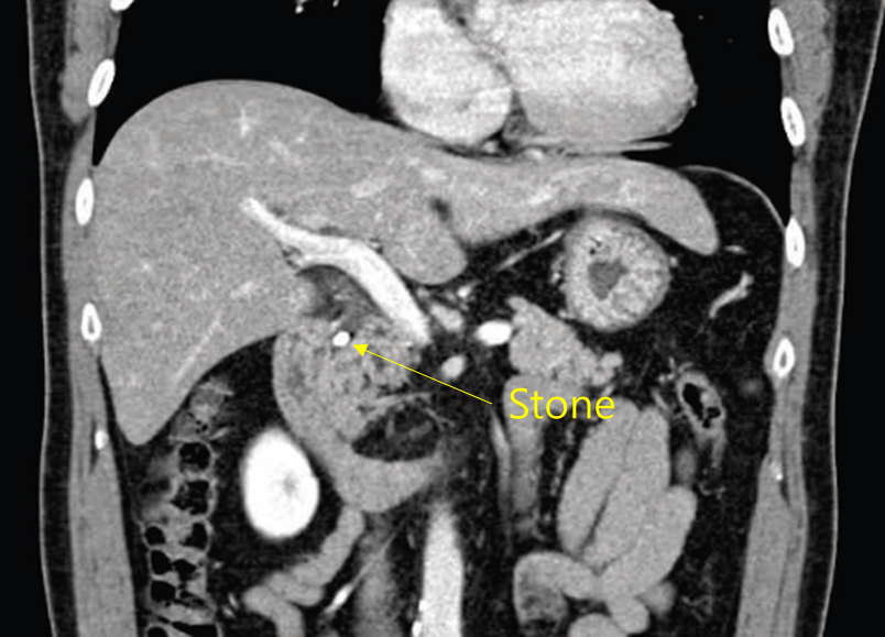 CT상 CBD stone이 확인되며 Charcot’s triad가 확인되므로 acute cholangitis 진단 하, ERCP를 통한 CBD stone removal을 시행한다.