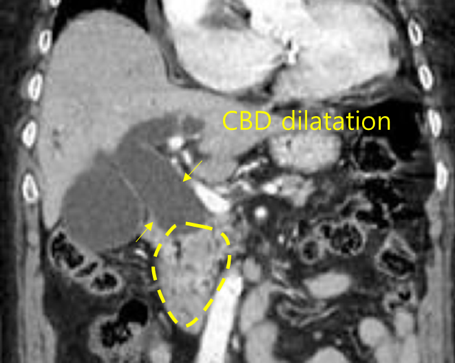 Img | 복부 CT: GB enlargement, proximal CBD dilatation, periampullary mass |