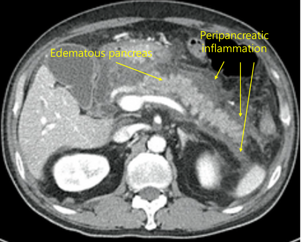 Img | CT: 췌장 종대 및 췌장 주위 fluid collection |