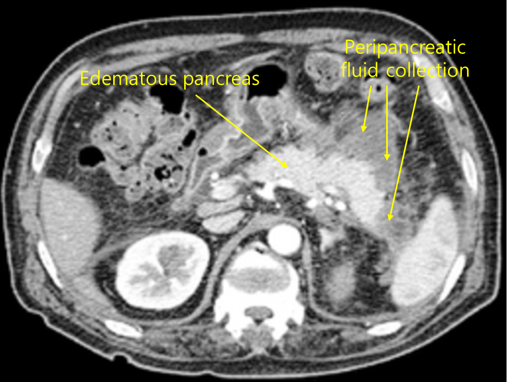 진단 | • US: 담석, 담관확장 확인 • CT: 췌장 실질의 edema, 췌장 근처 조직의 inflammation |