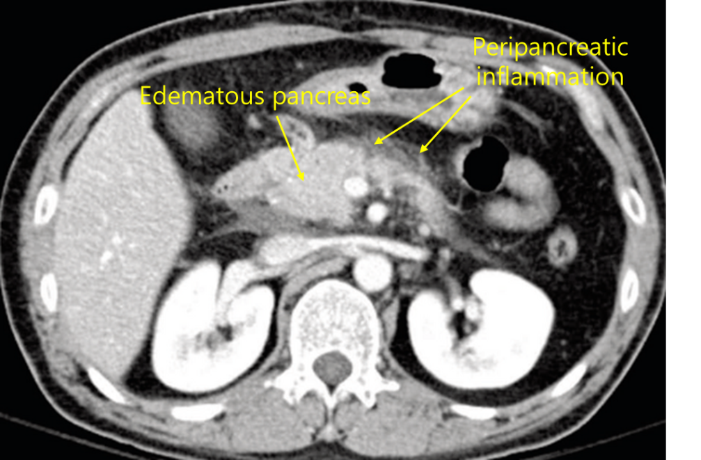 • CT상 edematous한 pancreas와 pancreas 주변의 fluid collection이 확인되며, 이는 acute edematous pancreatitis에 합당한 영상 소견이다.