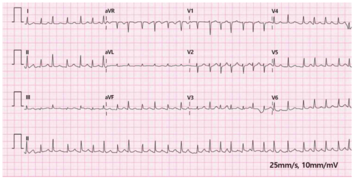 • 흡기 시 수축기 혈압이 63mmHg로 원래 혈압에 비해 10mmHg 이상 감소한 기이맥(paradoxical pulse)과 함께 HR 145회/분의 빈맥이 확인되며 ECG 상 low QRS voltage, QRS complex 크기가 교대로 커지고 작아지는 교대맥(electrical alternans)가 보이므로 심장 눌림증으로 진단할 수 있다.