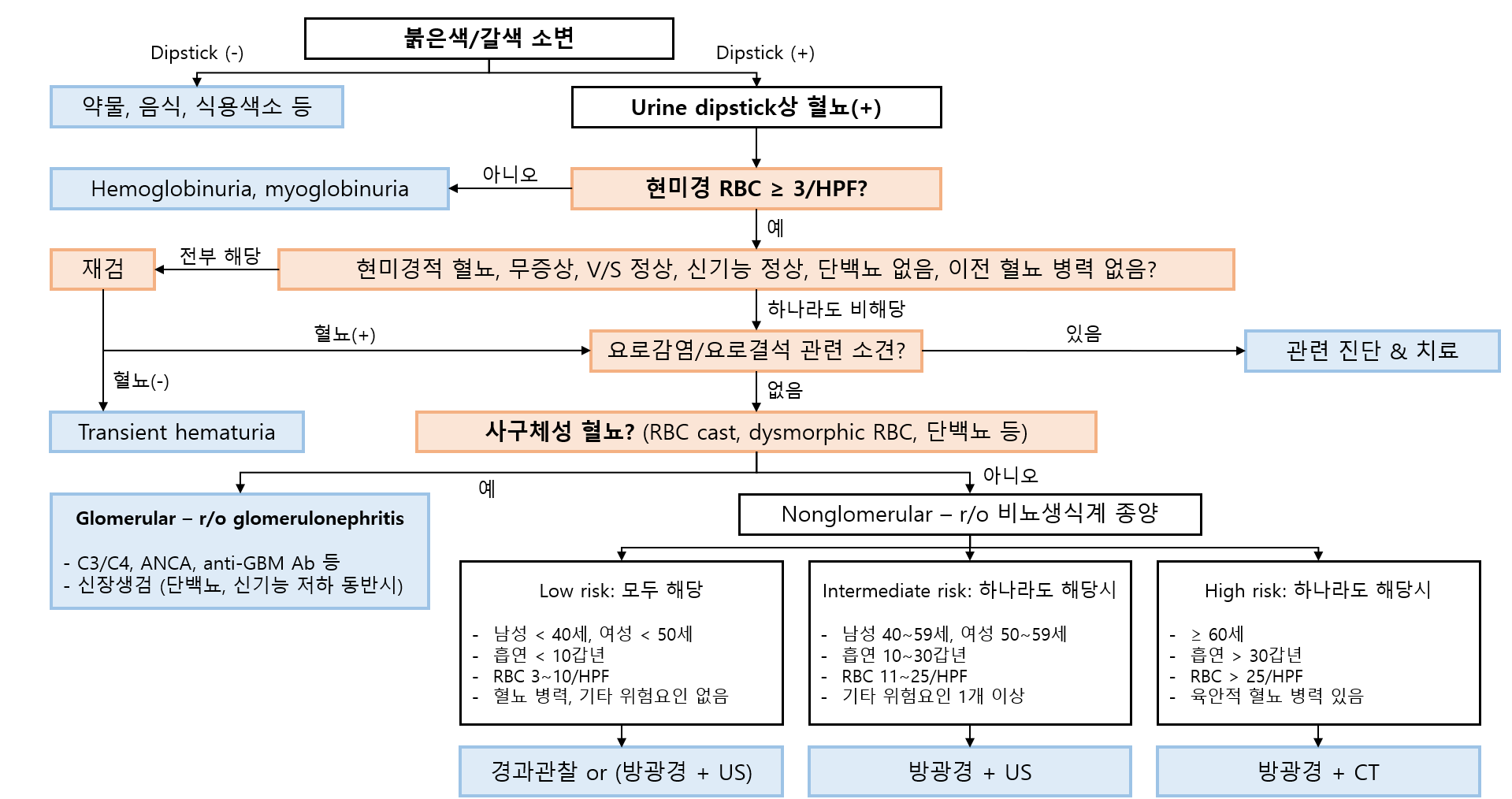 • 하루 전부터 소변색이 붉어서 내원한 58세 여자 환자이다.