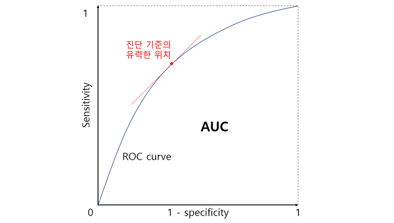 • 여러 진단검사의 우열을 비교할 때, AUC가 클수록 유용하다.