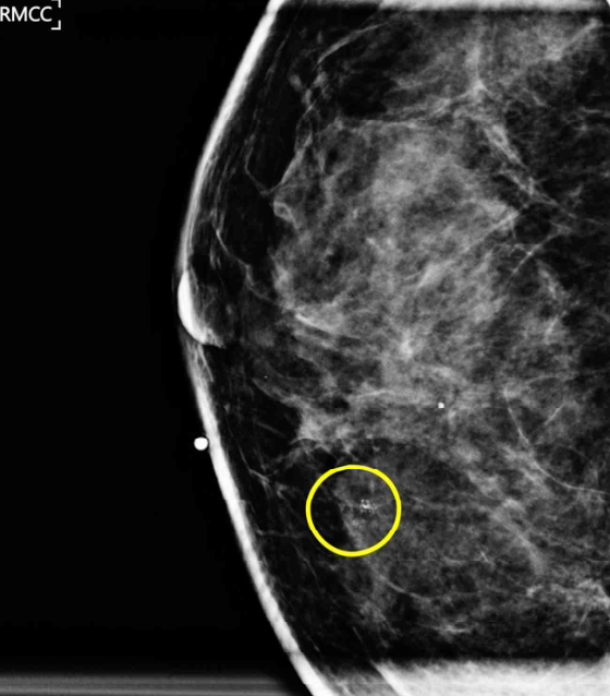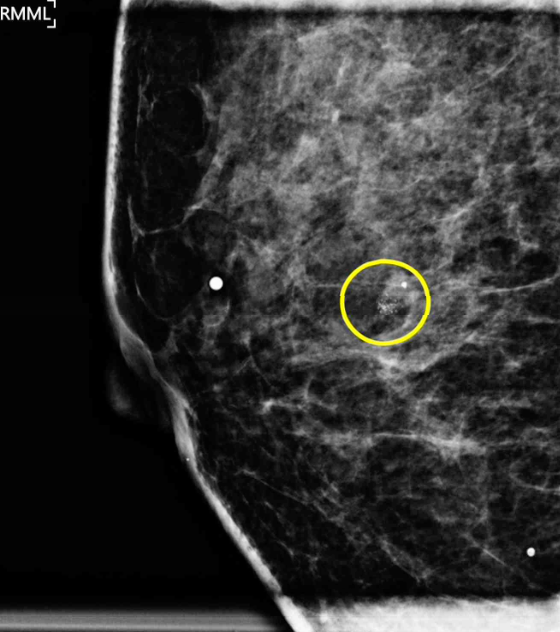 • MAM상 grouped, fine pleomorphic calcification이 확인되므로 악성 종양에 대한 감별이 필요하며, 이는 조직검사를 통해 이루어진다.