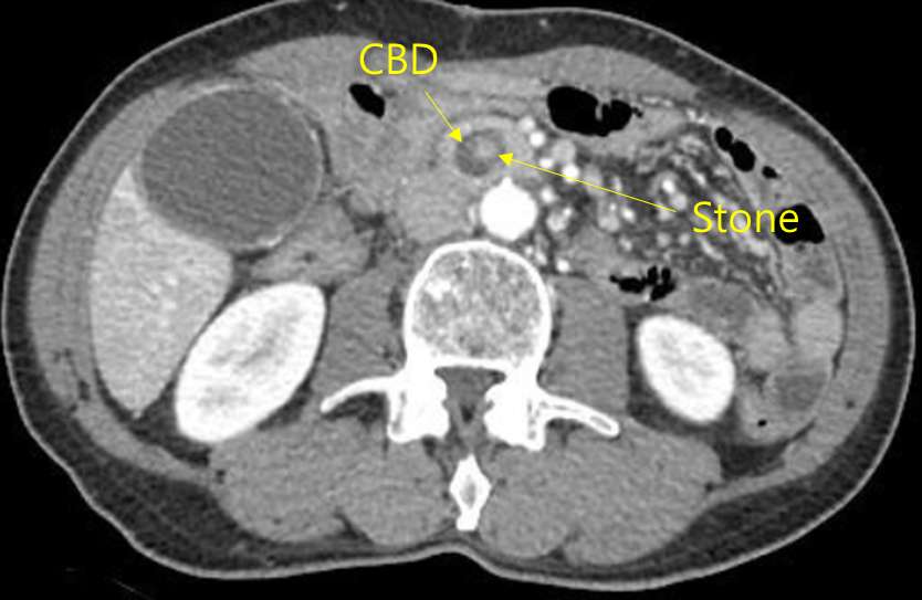 • 이를 확인하기 위한 CT에서 CBD dilatation이 보이며, MRCP에서는 CBD stone으로 추정되는 filling defect가 관찰되며 그 defect보다 proximal하게 bile duct dilatation이 보인다.