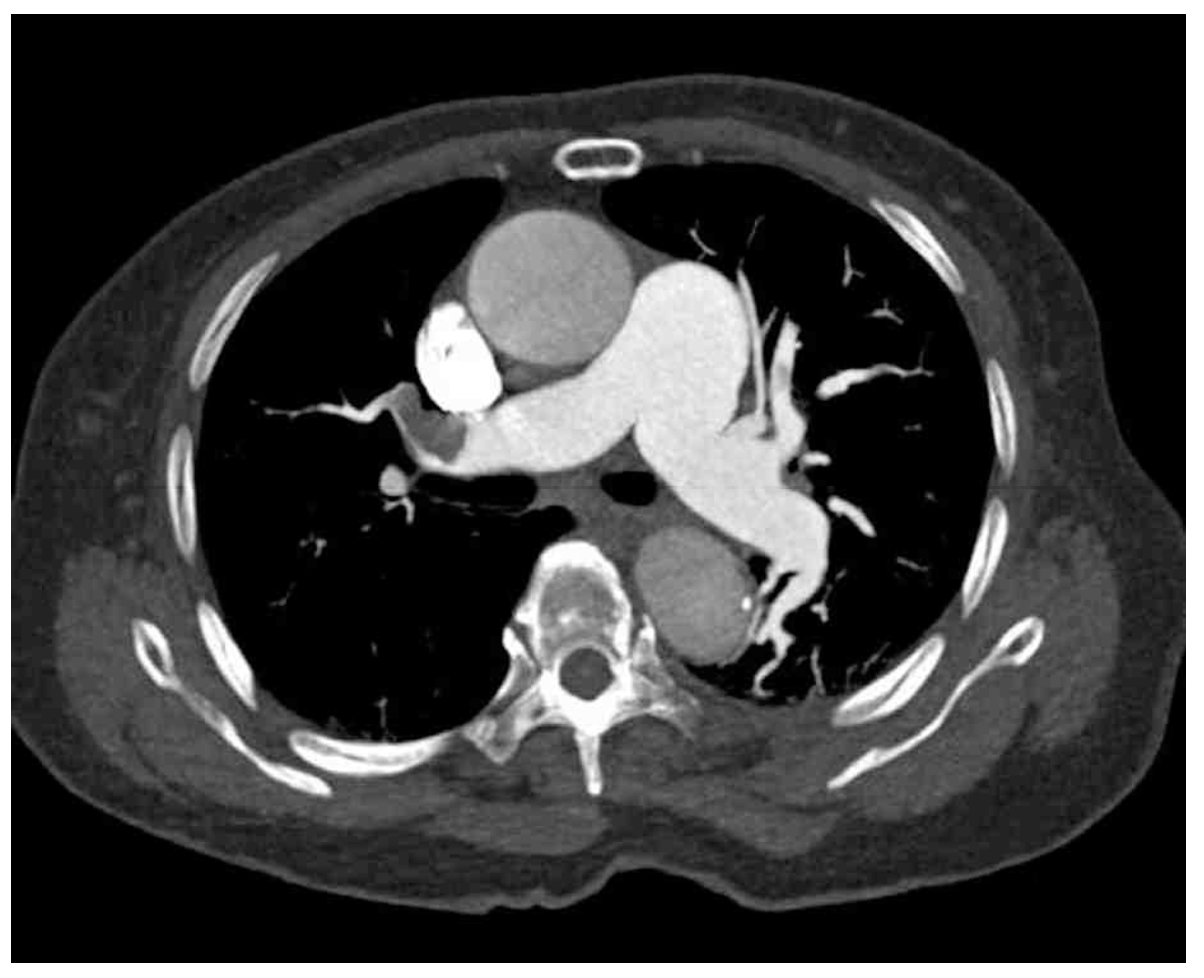 • 수술 후 침상 안정 상태였던 환자가 혈역학적 불안정성을 동반한 급성 호흡곤란을 보였으며, 심장성, 호흡기, 감염성 원인을 시사하는 소견이 확인되지 않았다. 이에 따라 폐색전증 의심하 조영증강 컴퓨터단층촬영을 시행하였다.