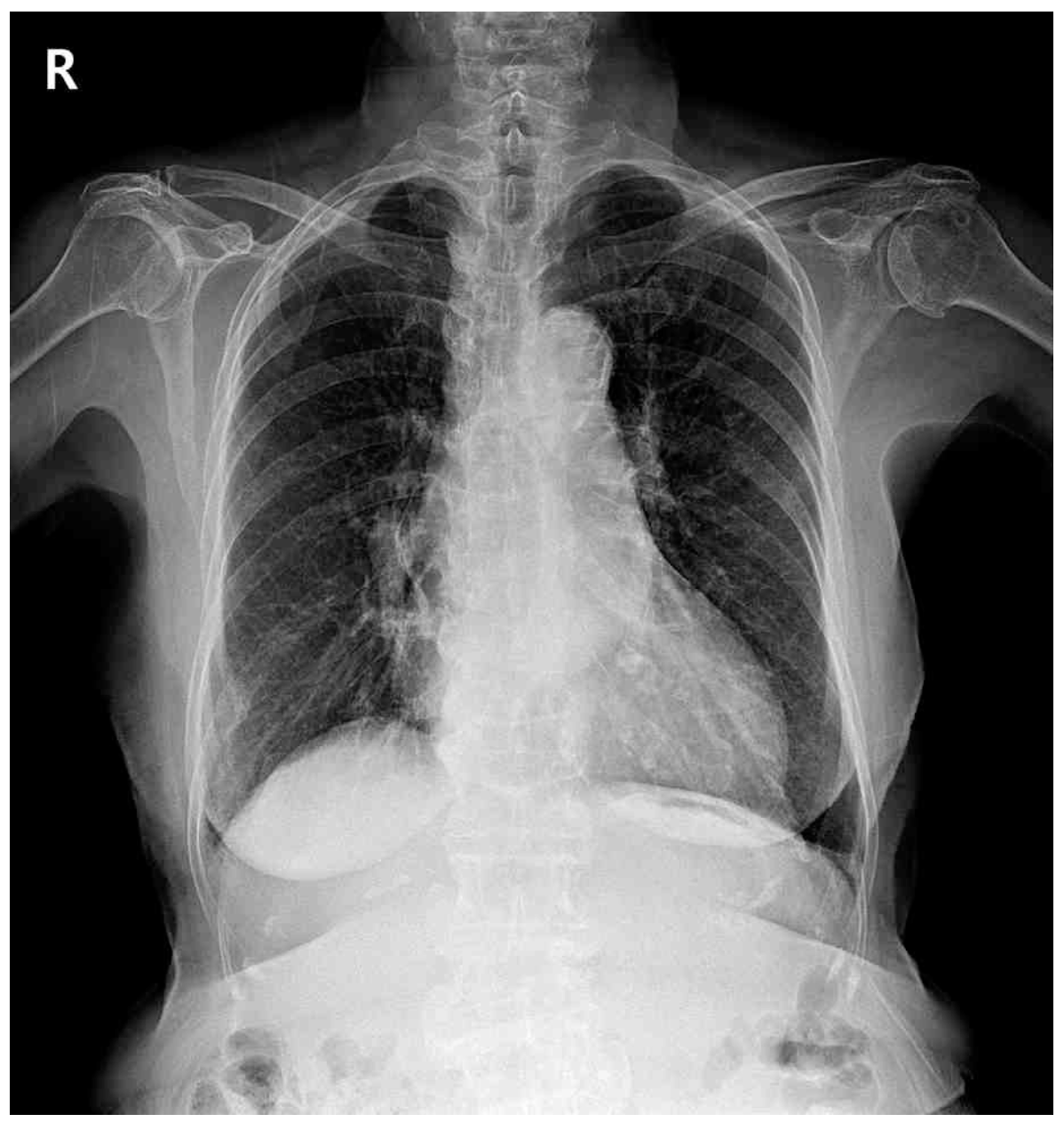 • 대동맥박리: 특징적인 찢어지는 듯한 극심한 흉통과 mediastinal widening이 CXR에서 확인된다.
