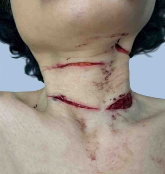 • 52세 여자가 30분 전 목을 자해하여 응급실에 내원하였다.