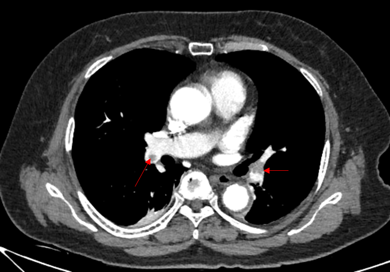 • 이에 촬영한 CT상 실제로 pulmonary a.에 thrombus가 관찰되므로, PTE로 진단한다.