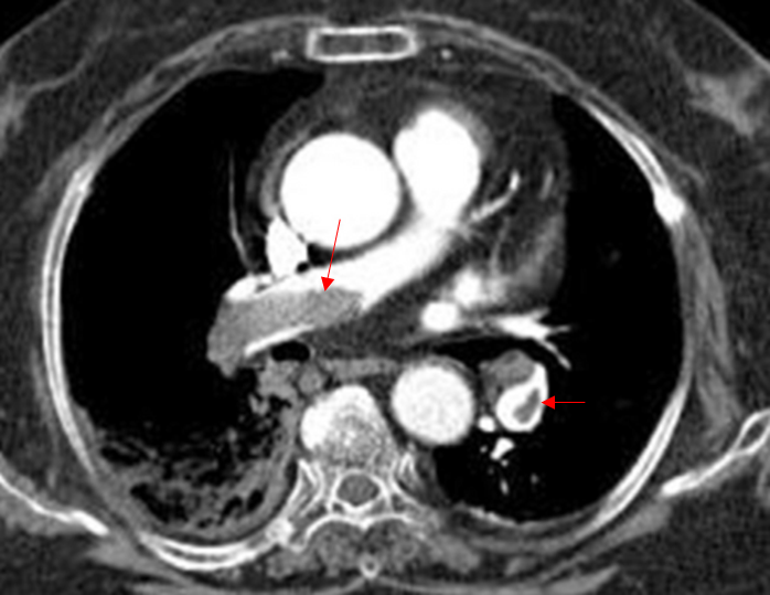 • DVT 증상, 빈맥으로 보아 PTE가 매우 의심될 뿐만 아니라, V/S이 불안정하므로 바로 CT를 촬영했다. CT상 pulmonary a. 내부에 큰 혈전이 보이며, PTE로 확진할 수 있다.