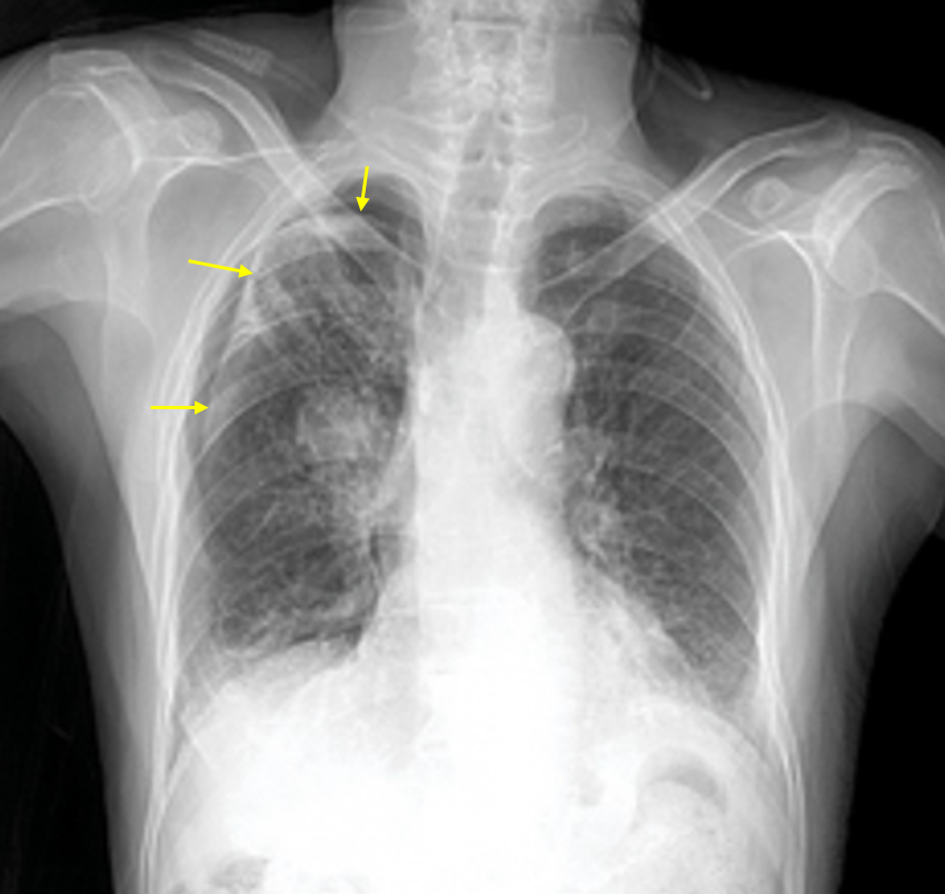 • CXR에서 우측 폐에 pleural line이 보이며 distal vascular marking이 소실되었으므로 기흉으로 진단할 수 있다.