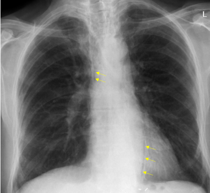 • CXR상 아래와 같이 mediastinum 쪽의 pleural line이 확인되어 pneumomediastinum으로 진단할 수 있다.