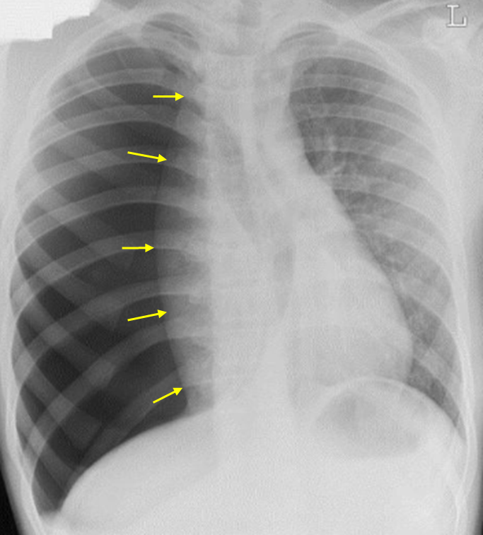• 환자가 젊은 남자이고 키가 크고 마른 체형인 것을 감안하면, 급성 흉통 및 호흡곤란은 기흉에 의한 것일 가능성이 높다. 우측 호흡음이 감소한 것도 기흉을 시사한다.