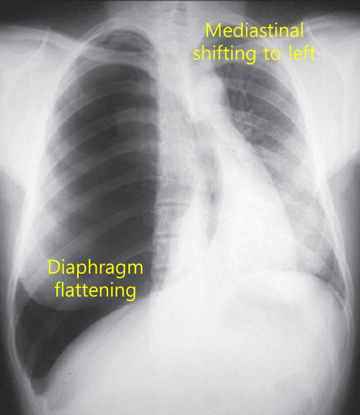 Img | CXR: 우측 폐 bronchovascular marking 사라짐, 심장 및 기도 좌측 이동 |