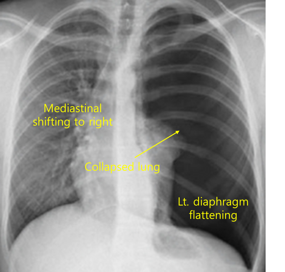 Img | CXR: 좌측 폐 bronchovascular marking 사라짐, 심장 및 기도 우측 이동 |
