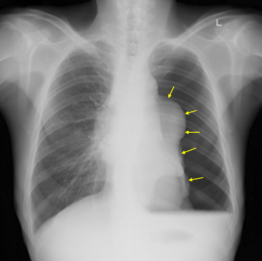 • CXR상 좌측 폐혈관 음영이 전혀 보이지 않으므로 매우 큰 크기의 기흉이 있음을 알 수 있으며, 좌측 폐는 완전히 collapse된 것으로 보인다. 또한 좌측 흉강에 air-fluid level이 있으므로 흉막 삼출이 합병되었다고 볼 수 있다.