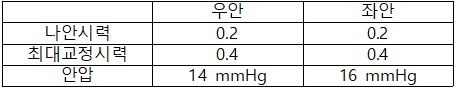 S/Sx | 5년 전부터 서서히 악화된 시력, 주간 빛번짐 나안시력 : 양안 0.2, 최대 교정시력 : 양안 0.4, 안압 : 정상 시신경, 망막: 정상 |