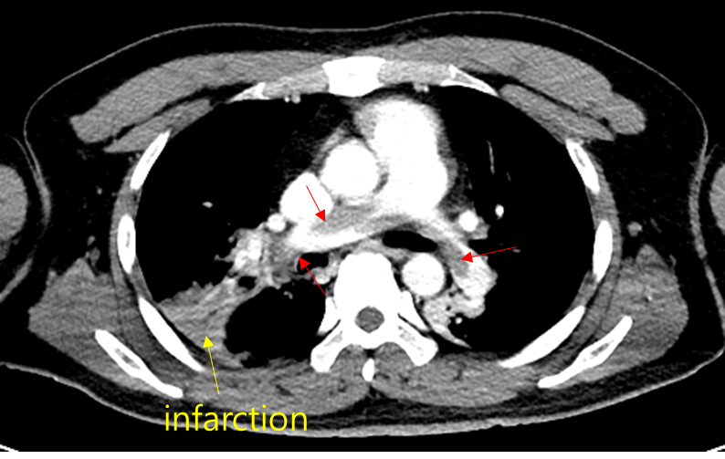 • PTE의 진단을 위해 빠르게 CXR 및 CT를 촬영했고, CT상 pulmonary a. 내부의 thrombus가 관찰되므로 PTE로 진단할 수 있다. 우측 폐에 wedge-shaped consolidation이 있는데, 이는 PTE의 microthrombus에 의해 흔히 발생하는 segmental lung infarction으로 추정된다. 객혈도 이 infarcted lung에 의해 발생했을 가능성이 높으며, 신체진찰상 우측 윗가슴의 호흡음 감소와도 correlation 된다.