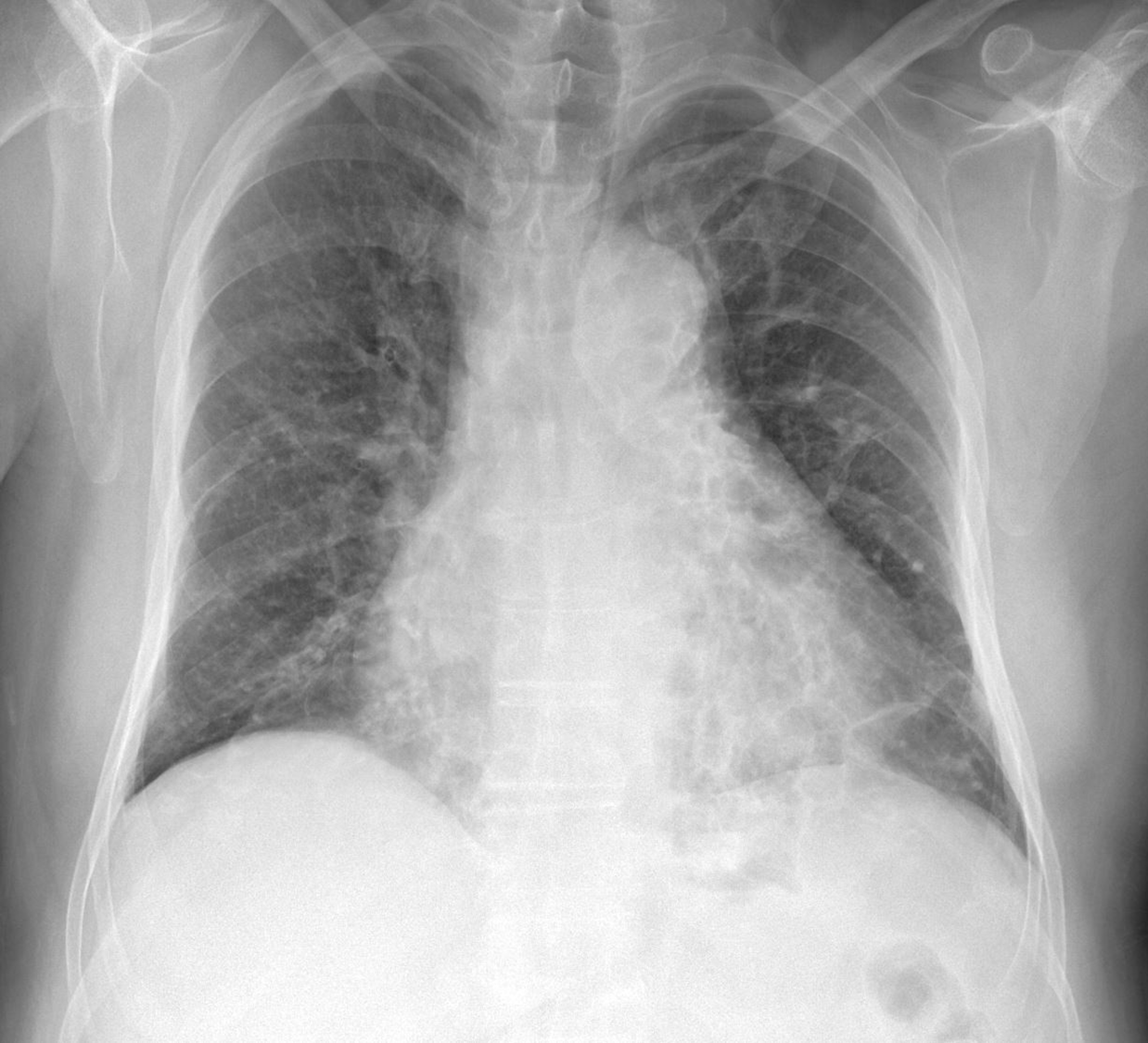 65세 여자가 6개월 전부터 간헐적으로 가래에 피가 조금씩 묻어나온다고 한다. 1달 전부터는 매일 찻숟가락정도 가래에 피가 묻어나온다고 한다. 비흡연자이고 특별히 복용하는 약은 없다고 한다. 어릴 적부터 감기에 자주 걸렸었다. 가슴 X-ray 사진은 아래와 같다. 청진상 우측 폐하부에 거품소리가 들린다. 진단은?