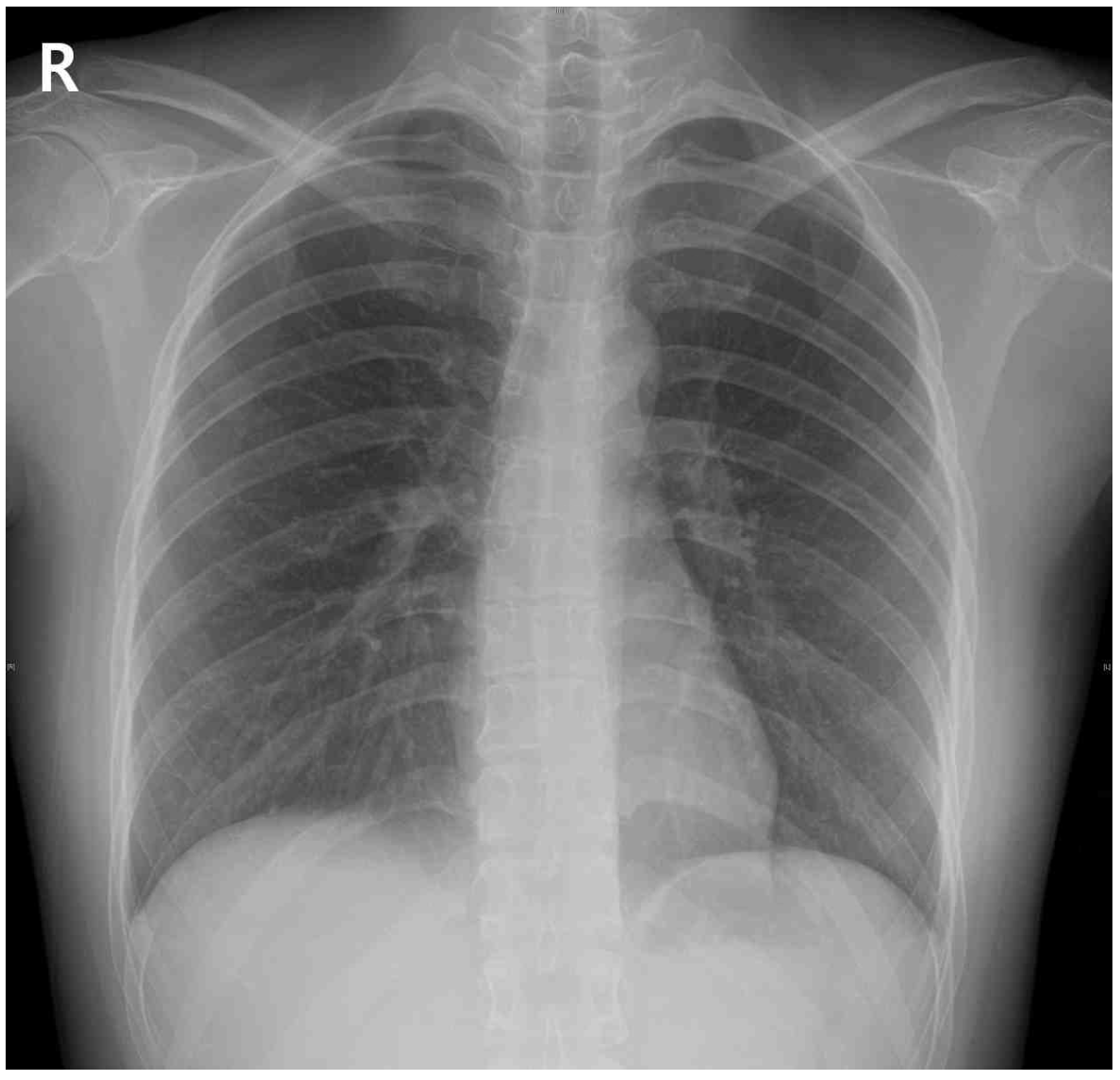 35세 남자가 10일 전부터 기침을 한다며 병원에 왔다. 남자는 초등학교 교사로, 단체여행을 다녀온 후 몸살을 앓았다고 한다. 가래는 기침 끝에 흰색이고 소량으로 나왔다. 비흡연자이다. 혈압 110/60 mmHg, 맥박 80회/분, 호흡 15회/분, 체온 36.8°C이다. 목 안 진찰 소견과 호흡음은 정상이다. 가슴 X선사진이다. 혈액검사 결과는 다음과 같다. 진단은?