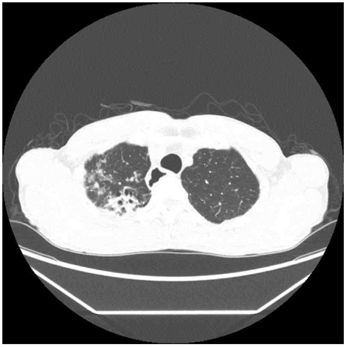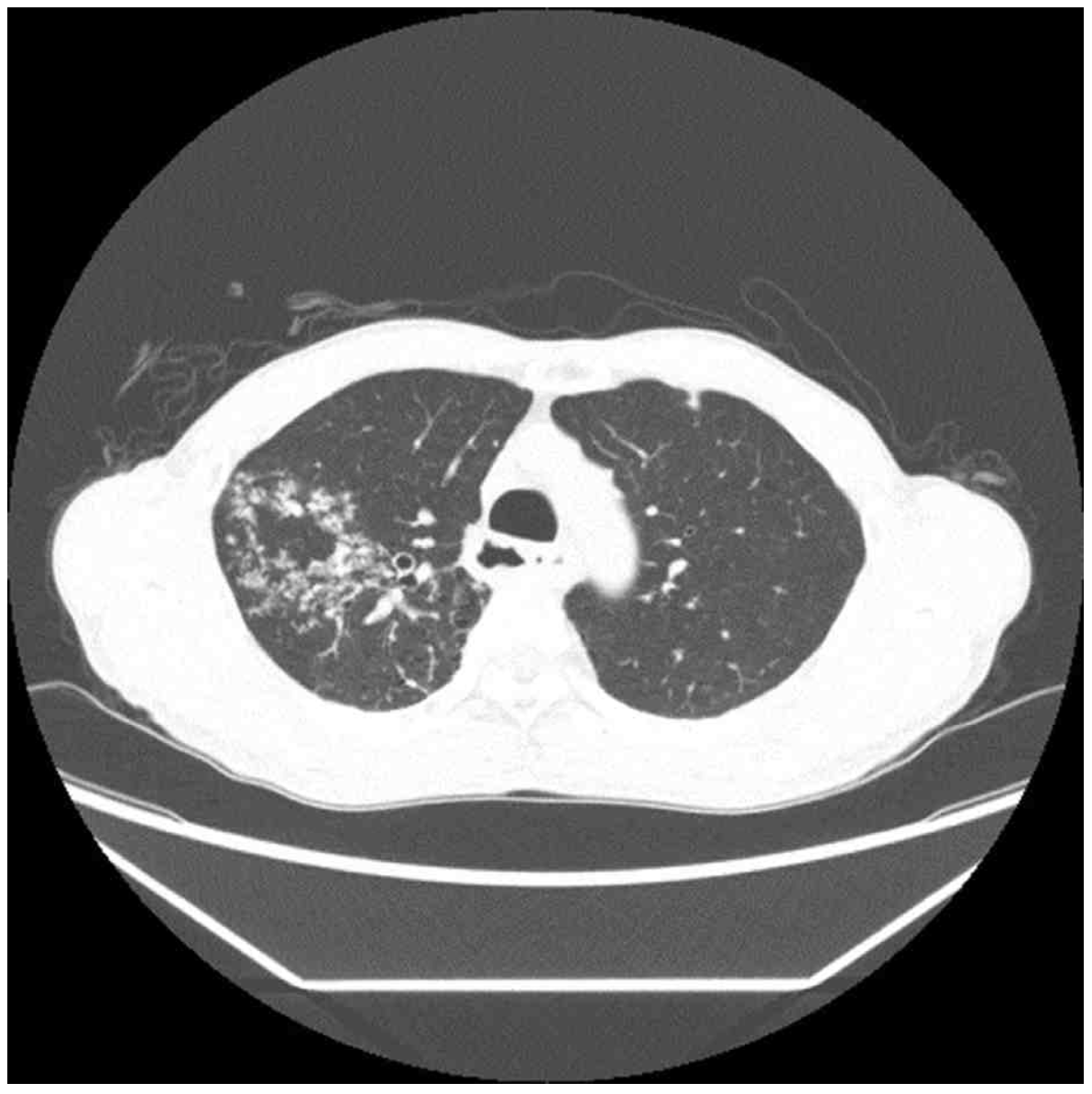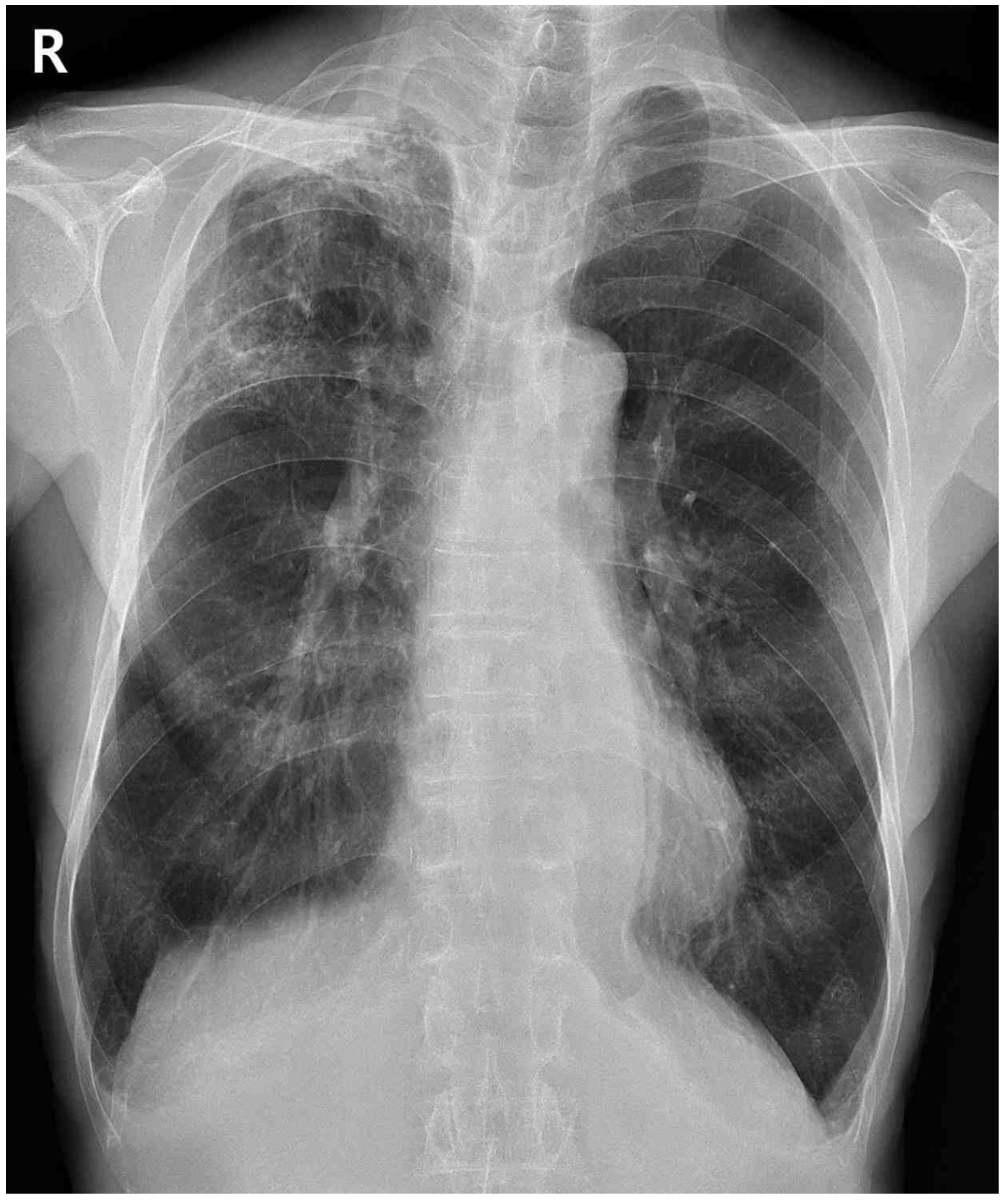 • CXR상 RULF hazziness가 발견되며 chest CT에서도 RULF에 centrilobular nodule 및 tree-in-bud pattern이 관찰된다. 만성 기침, 가래, 미열 등의 임상 양상과 영상 소견을 종합하여 판단할 때 폐결핵을 반드시 의심해보아야 한다.