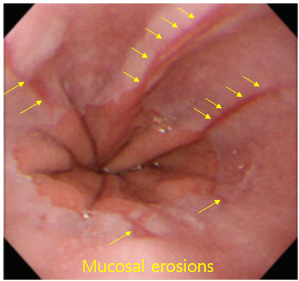 • 내시경에서 식도 미란이 확인되었으므로 위식도역류질환 중 미란성식도염에 해당한다.