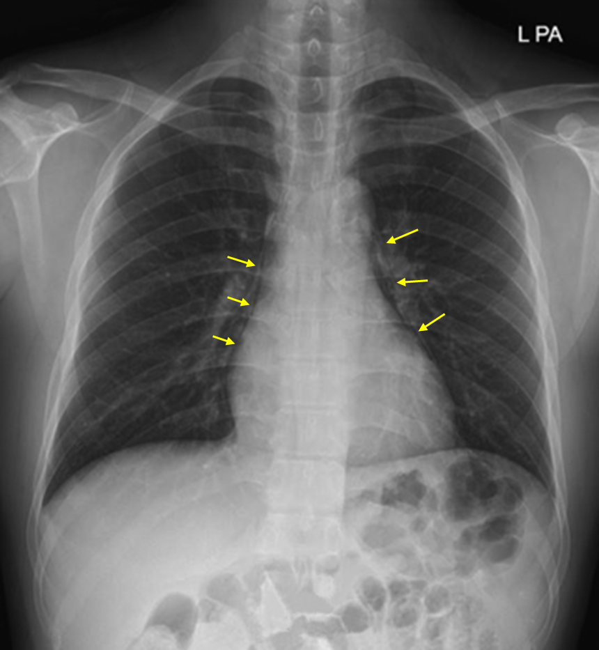 Img | CXR: Bilateral pleural line adjacent to mediastinum CT: Air inside mediastinum |