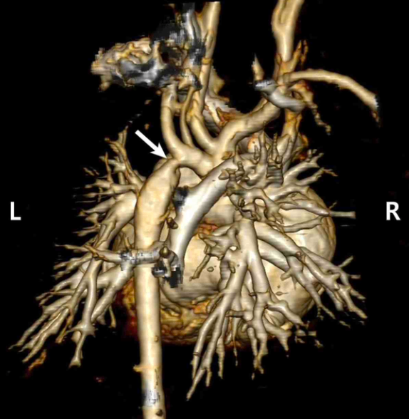 생후 7일 남아가 2일 전부터 호흡곤란과 소변량이 줄어 병원에 왔다. 임신나이 39주 5일, 출생체중 3,300 g, 질분만으로 태어났다. 출생 시 특이 문제는 없었다. 혈압은 오른팔 60/35 mmHg, 왼다리 45/25 mmHg이다. 심박 160회/분, 호흡 65회/분, 체온 36.8°C이다. 복장뼈 왼쪽 가장자리에서 2/6도의 수축기 심잡음이 들리며, 넓적다리맥박이 약하게 만져진다. 심장 컴퓨터단층촬영 사진이다. 진단은?