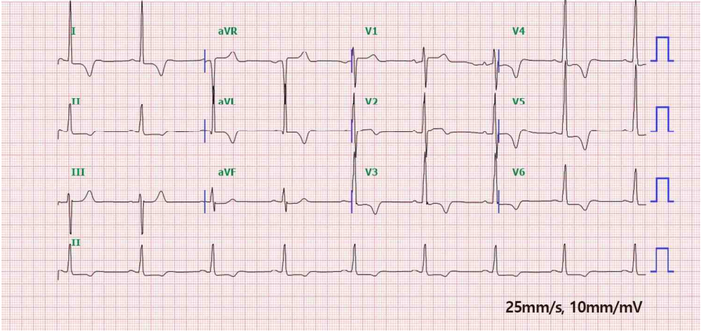 • 심음 청진상 Lt. 3rd ICS에서 수축기 잡음이 들리고 ECG에서 tall QRS complex(lead I, aVL, V4-6)가 관찰되어 LV hypertrophy를 확인할 수 있고 lateral lead(I, aVL, V5-6)에서 giant T wave inversion이 보이므로 HCMP를 의심할 수 있다.