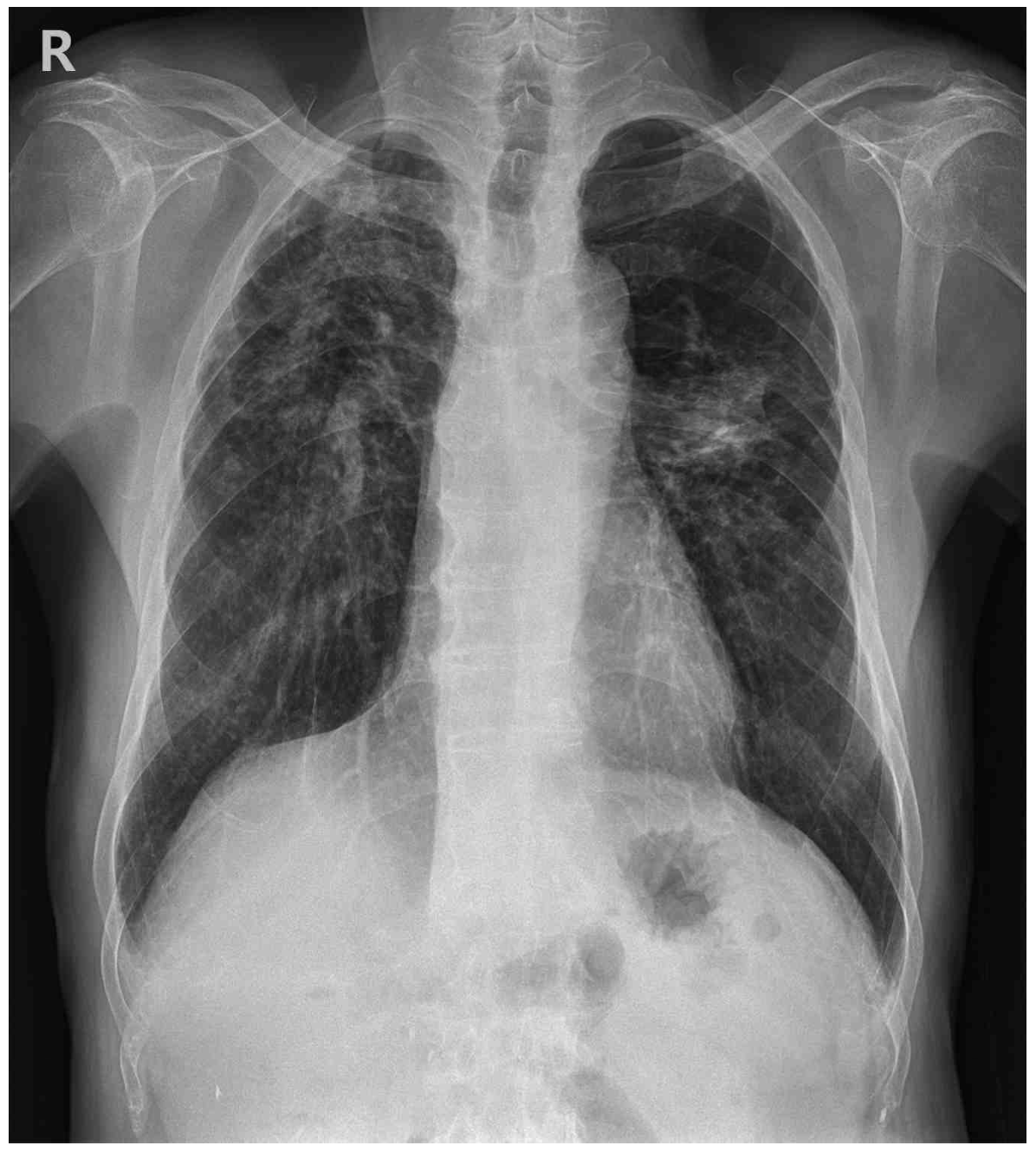 • 흉부 X선 검사에서 양측 폐야에 patchy consolidation이 관찰되었으며, 흉부 컴퓨터단층촬영에서 다수의 결절, 종괴 및 간유리 음영이 확인되었다. 특히, 상엽 부위에서 대칭적으로 위치한 종괴가 관찰되는 점을 고려할 때 규폐증으로 인한 진행성 거대 섬유화 가능성이 높다고 판단된다.