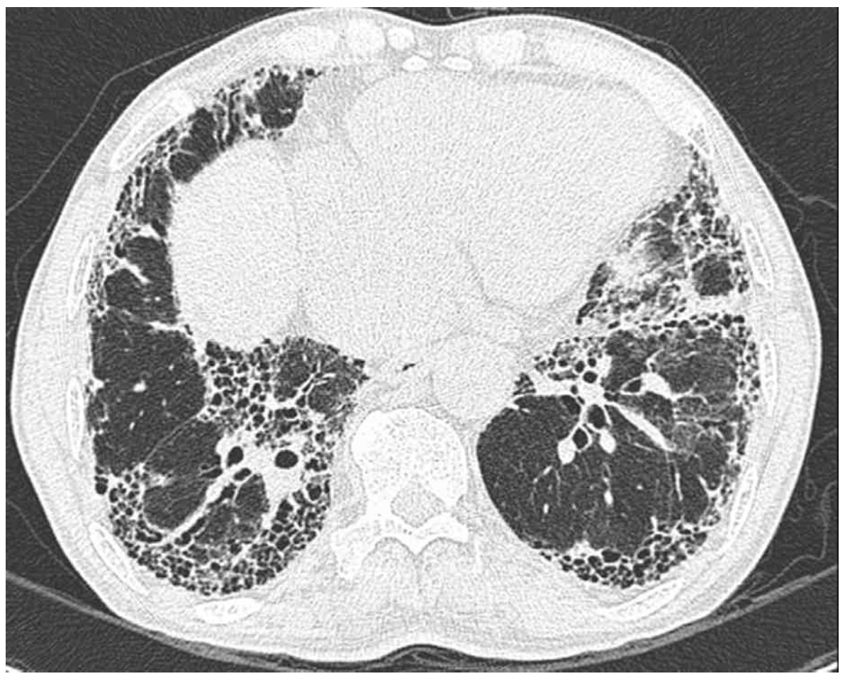 • CXR상 폐 전반에 reticular marking이 증가되어 있으며 자세한 평가를 위해 시행한 HRCT에서 subpleural/basal predominance, honeycombing, reticular abnormality의 통상성 간질성 폐렴(UIP) pattern이 관찰되고 있다. 이는 IPF에서 전형적으로 나타나는 영상학적 소견으로, 환자의 악화된 호흡곤란은 새로운 원인보다는 기존에 진단받은 IPF가 진행함에 따라 발생한 것으로 판단된다.