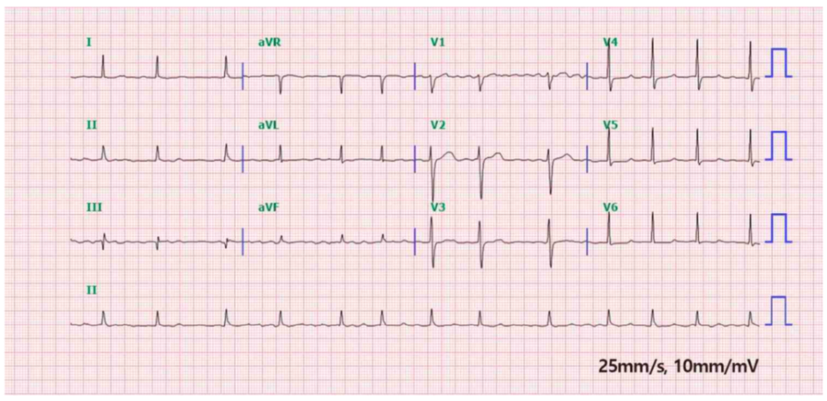 • 불규칙한 심음과 함께, ECG에서 irregularly irregular RR interval, lead V1에서 확인되는 no organized P wave 및 fibrillatory baseline을 통해 AF로 진단가능하며 AF로 인해 LA enlargement 및 diastolic dysfunction이 생긴 것으로 추측할 수 있다.